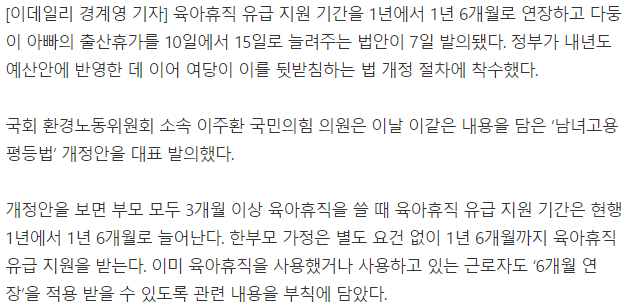 육아휴직 유급 지원 기간을 1년에서 1년 6개월로 연장하고 다둥이 아빠의 출산휴가를 10일에서 15일로 늘려주는 법안이 7일 발의됐다. 정부가 내년도 예산안에 반영한 데 이어 여당이 이를 뒷받침