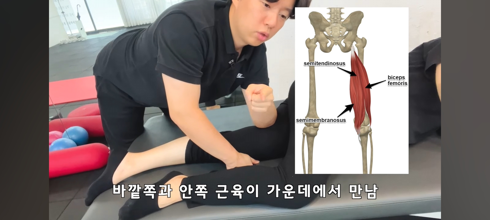 '거꾸로 된 Y자' 모양처럼 맞닿는 안쪽과 바깥쪽의 햄스트링 근육을 꾹 눌러 풀어줘요.