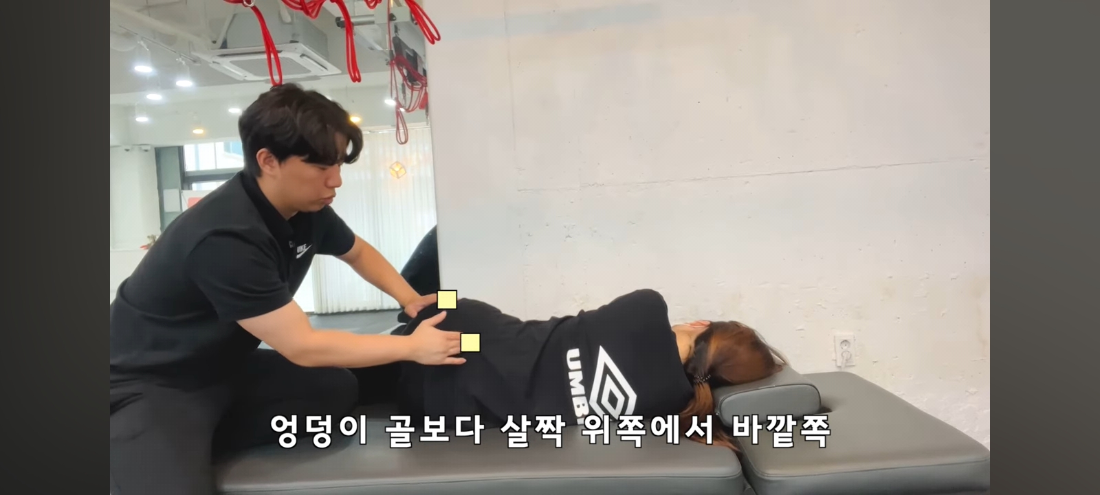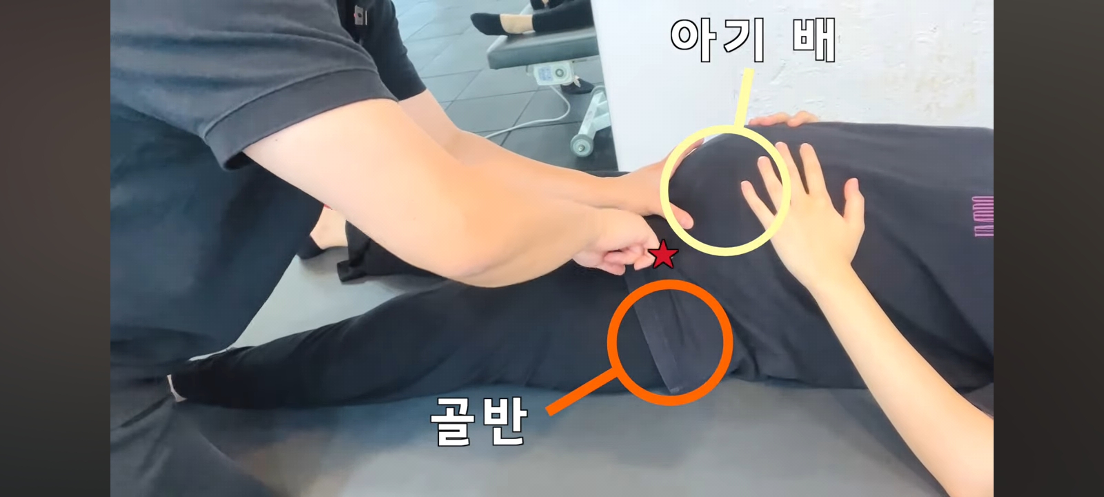 골반 부분에는 손가락을 눌러주고, 다리를 흔들며 허벅지 근육을 마사지하는 것이 좋아요.