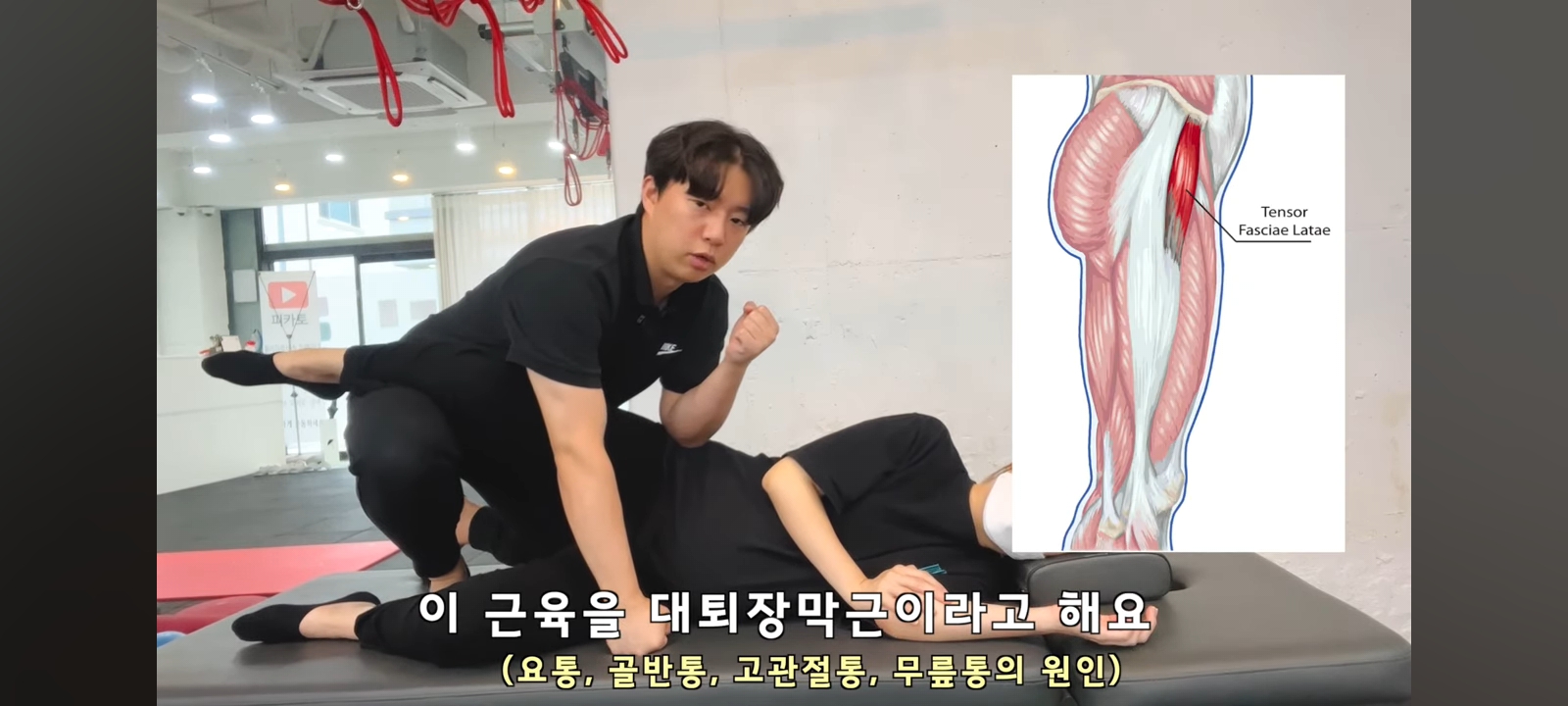 이 운동은 '대퇴 장막근' 근육을 이완시키는 데 효과가 있어요.