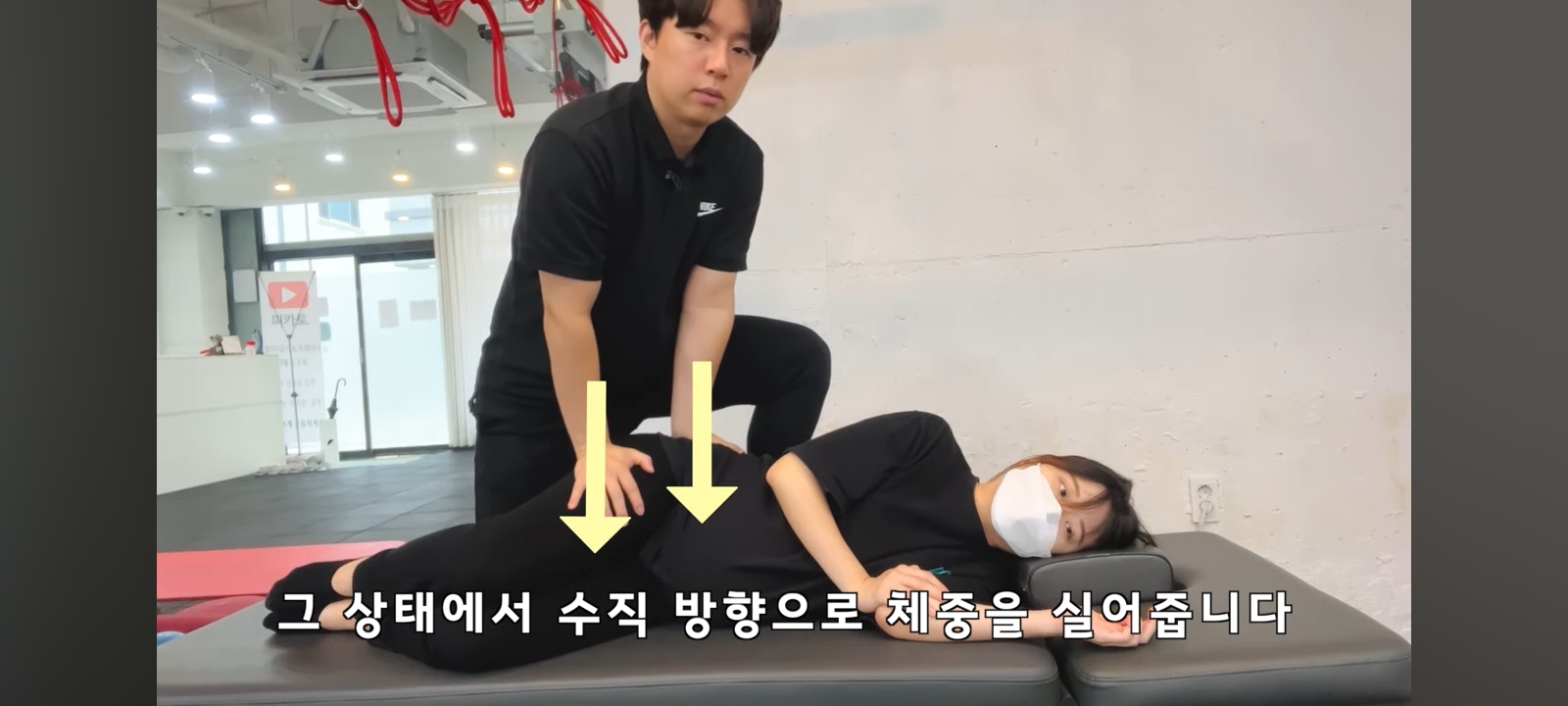 엉덩이와 허벅지를 잡아 수직으로 체중을 실어주면서 허벅지 근육을 푸는 거예요.