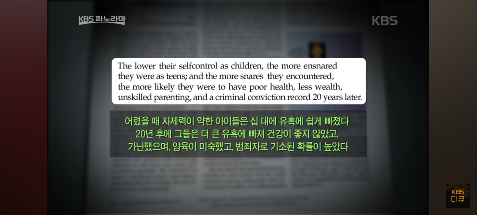 영유아기의 자제력이 약한 아이들은 유혹에 쉽게 빠져 건강이 좋지 않고 가난하며 범죄자로 기소될 확률이 높다는 것이 밝혀졌다고 한다.