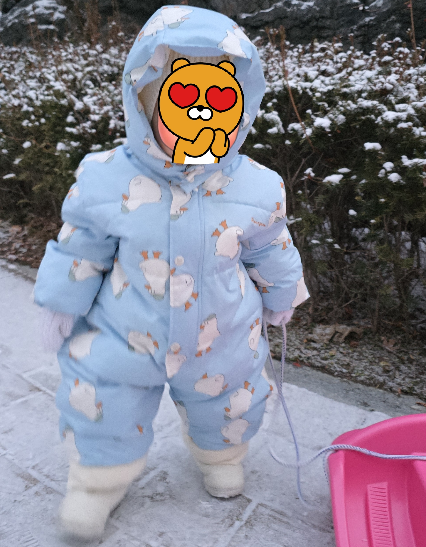 아기가 분홍색 썰매를 끌며 눈길을 걷는 모습이