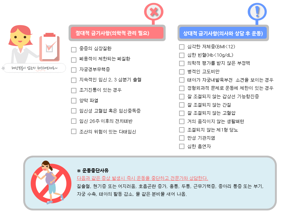 - 아래와 같은 사항을 갖은 산모는 운동을 금지하고 의사와 상담 후 운동을 실시하세요