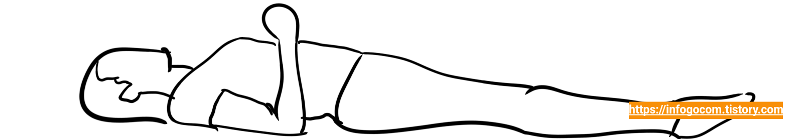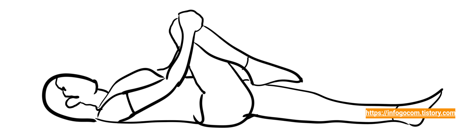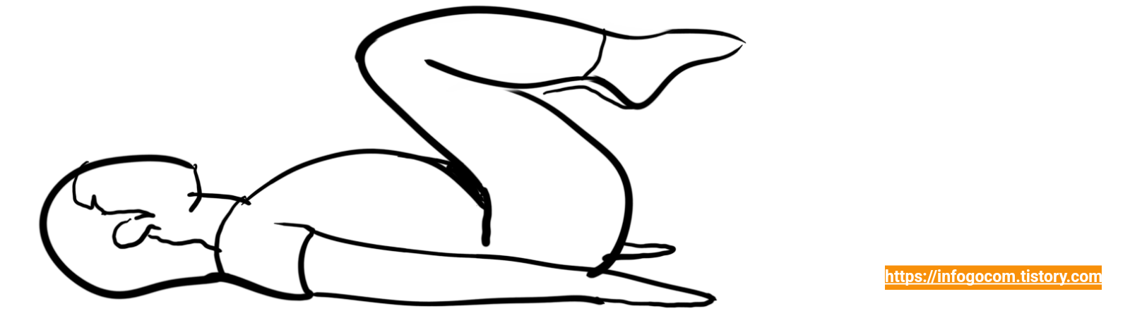 1) 바닥에 뚝바로 눕고 한쪽다리를 가슴 쪽으로 끌어당긴다.