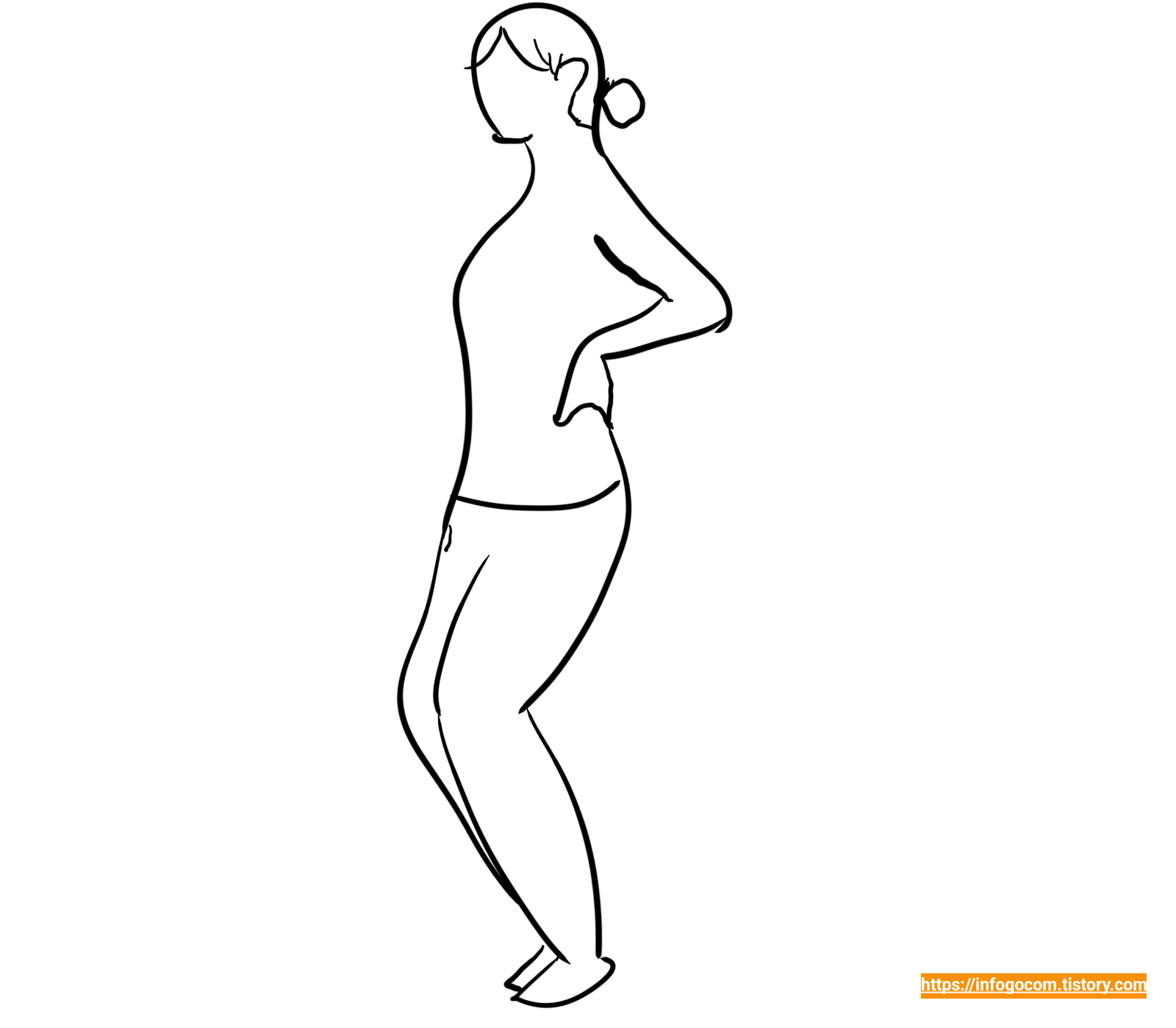 1) 발을 어깨너비로 벌려주고 손을 허리 뒤춤에 대준다.