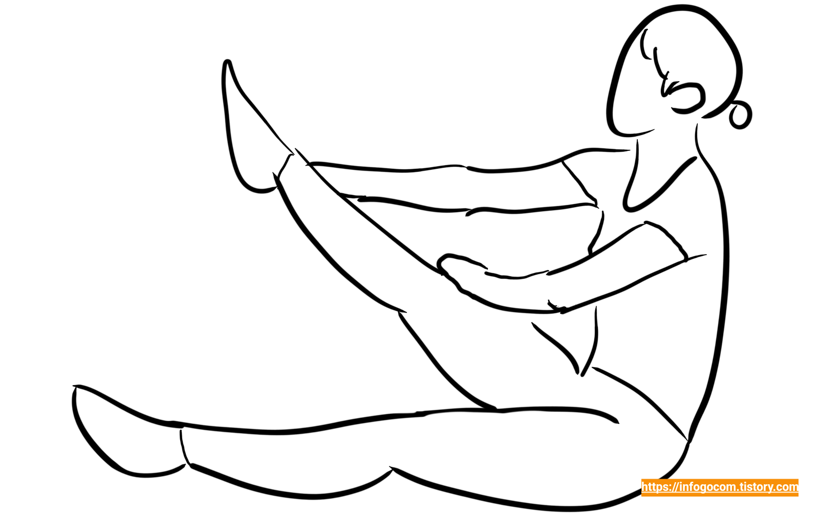 1) 앉아서 한쪽다리를 같은 쪽 손으로 잡고 올린다. (이때 다른 손은 무릎을 위에 얹는다.)